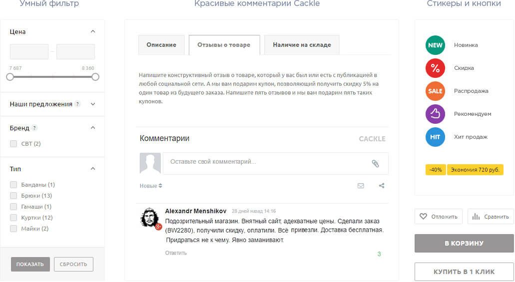 • внедрили виджет сервиса Cackle в карточку товара – для красивых комментариев.